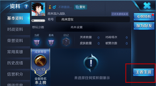 1. 现在,你可以通过个人基本资料中的“王者生涯”按钮来访问TA的生涯状况了,TA在各个战场的探索进度,尽可查看