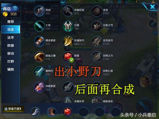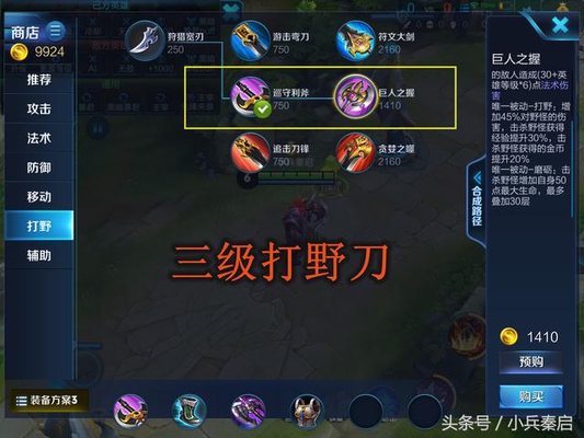 比如小兵在新赛季使用典韦打野,第一件出了小野刀后,紧接着就会出鞋子,然后是合成陨星,之后才会再合成二级打野刀,然后是暗影战斧,按着这样的顺序,使前期打野和GANK更有效。