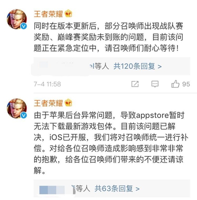 此外,王者荣耀IOS版后台异常,导致appstore无法下载最新游戏包的事情,官方已经处理完毕,IOS在今天下午也已经正式开服,对于玩家无法正常登陆游戏,天美随后将会统一对召唤师们做出补偿。