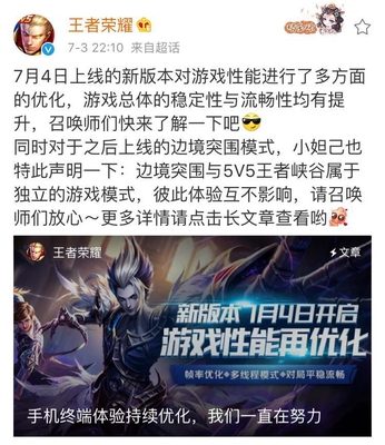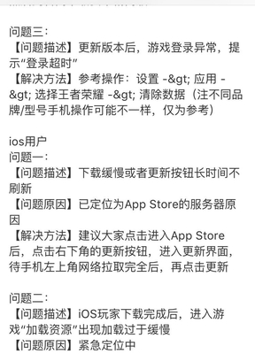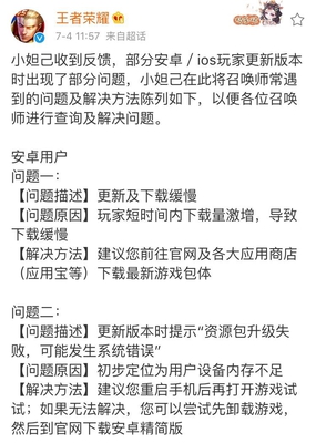 王者荣耀的官方微博也发布了声明,解决了安卓用户更新缓慢和系统发生错误安装包丢失等问题,苹果系统的更新长时间不响应问题也得到了解决,官方还在问题处注明了发生原因,可以说是给了玩家们一个合理的解释。