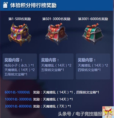 言归正传,下面我们一起来看看体验服有哪些活动吧。每个赛季末,会有8万名玩家可以通过积分排名得到不同的奖励。全服1到500名的玩家,会得到永久的电玩小子、14天的天魔缭乱体验卡2张、1个五级铭文宝箱。501到3000名的玩家,会得到14天的天魔缭乱体验卡2张、1个五级铭文宝箱。3001到6000名的玩家,会得到14天的天魔缭乱体验卡2张、1个四级铭文宝箱。6001到10000名的玩家,会获得14天的天魔缭乱体验卡1张、1个四级铭文宝箱。10001到30000名的玩家,会获得14天的天魔缭乱体验卡1张。30001到80000名的玩家,会获得7天的天魔缭乱体验卡。这个奖励中,最重要的就是鲁班的电玩小子,是永久皮肤共有500个,会直接发放到正式服。