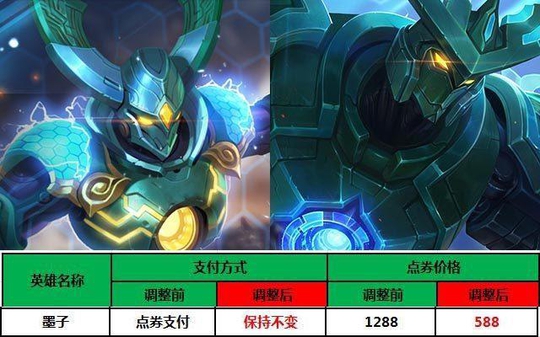 如上图,同样的,左边是2015年前的墨子原画,在当时,墨子这位英雄的价格也是跟狄仁杰一样,英雄价格也需要1288点券,不知道当时有没有玩家购买,估计买的人也不多,土豪倒是无所谓。相比以前的墨子,现在的墨子原画看起来像是变形金刚,很有机械感。