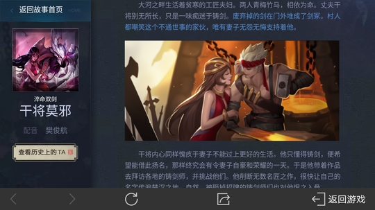 干将和韩信有点相似,干将是一个铸剑师,与妻子莫邪相亲相爱,干将只会铸剑,并希望依此名满天下,于是向一位位著名的铸剑师挑战,干将的剑斩断了许多大师的剑,可最后落败于天下第一大师手里,干将为了报仇,疯狂铸剑甚至忽视了妻子,由于太专注没注意妻子越走越近,妻子跳入了铸剑炉中,干将在悲痛中,完成了铸剑,虽然妻子以剑的形式复活了,但总没有真人好