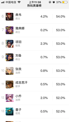 接下来就是我们的战士联盟了,5、6、7、8名,全是战士坦克,现在典韦真的强,胜率高,出场率也高,出场率是在全英雄中排名第4的!