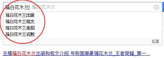 我们都知道,骚白的花木兰在国服堪称一绝。众多玩家为了学习到他这个英雄的精髓也是没少查找资料。这点通过某搜索引擎上的搜索记录可以看出。例如:骚白花木兰出装、骚白花木兰铭文、骚白花木兰连招、骚白花木兰沉默等这些都是玩家们搜索频率比较的关键词。如图: