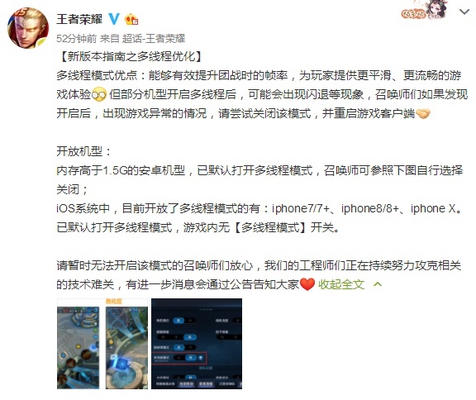 今天《王者荣耀》官微对游戏的多线程优化作了一些详细的说明,内存高于1.5G的安卓机型,现在游戏都会默认开启多线程模式了。而使用苹果手机的同学则是需要认真关注一下了,目前仅开放iPhone7/7P、iPhone8/8P、iPhoneX几款机型。如果你是这些机型以外的iOS设备,那估计还要再等等了。