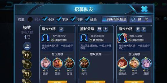 其次在现版本中有一个招募系统,但是实际体验效果一般,新版本中,招募系统增加了玩家擅长英雄荣耀战力显示,并且显示当前队伍缺少的位置,可以更加方便并且快捷的搭配合理的开黑阵容,让组队上分也更加容易,为天美点一波赞。