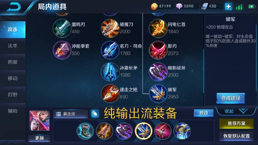 首先咱们先来看看元歌的出装思路,然后再去了解元歌的数字连招技巧。元歌是一名一名刺客英雄,目前适不适合打野先不说,但这套出装绝对称得上最贵的神装。首先还是以走暴击流出装为主,日常的抵抗之靴这是必备的,第二件无尽战刃,增加暴击伤害,利用普通攻击就能打出成吨的伤害,在配上暗影战斧,破晓和破军这三件神装合起来堪称完美,在肉的坦克英雄,看到这样的神装不得不颤抖几下。但有一点就是,元歌这套暴击流装备太托后期了,所以装备目前还要进一步更换思路。