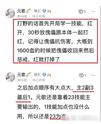 而这位天赋型选手也很是讲究,将对元歌的理解和经验分享出来。打野时一级学一技能,红开傀儡扛伤,红剩1600血收回傀儡惩戒秒掉,如此一来打野效率将大大提升。技能加点主二副三,有大点大,学一级一技能就行。