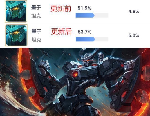 在新赛季中,墨子2技能爆发伤害下调,但增加了弹坑持续伤害,而且近战生存能也有大幅提高。自更新三天以来,墨子的排位胜率飞速增长,目前排位胜率已达到53.7%,位于全英雄第六。相比更新前已增加了1.8%的排位胜率,不过墨子的出场率依然略低,毕竟这个英雄的快感并不强,只有一个大招群控很恐怖。