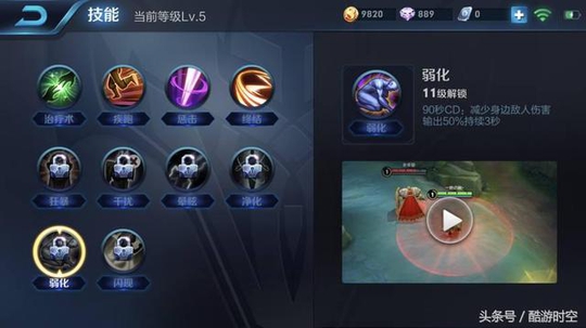 在闪现之前,玩家最后一个开启的召唤师技能是弱化,这个技能虽然虽然要求玩家的等级不低,但是在实际的排位和比赛当中,却很少登场,只在某些特殊的体系内,比如推塔流中存活,因此沦为了一个非常鸡肋的技能。