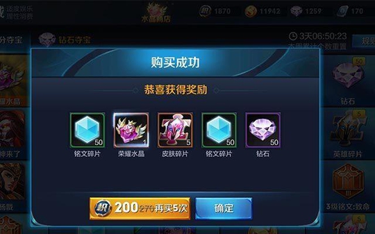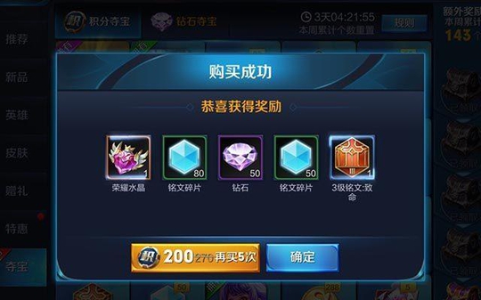 如上图,这位玩家是在凌晨5点之后,先是排位连跪了5场,中间还有几场是有人挂机的,因为是凌晨5点,这个时候的人是很有困意的,所以一不小心睡着了,就很容易挂机了。这位玩家等连跪之后,就立马去积分夺宝来个5连抽,大概4到5次之后,然后就获得了1个荣耀水晶。