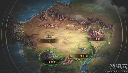 云中漠地处于王者大陆中的长城和王者峡谷之间,其中分布着三大城市,分别是诞生玉石的玉城、抵御魔种肆虐守卫云中漠地的都护府(长安军队)、以及传播知识的学者之城—千窟城!三者的具体位置如下图所示:
