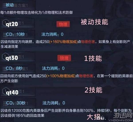 新英雄囚徒定位突进收割型战士,被动效果为提升AD可获得额外双抗值(正比关系),技能机制包含了位移、减速、回血和100%暴击伤害,值得一提的是三个主动技能都与剑影相关!