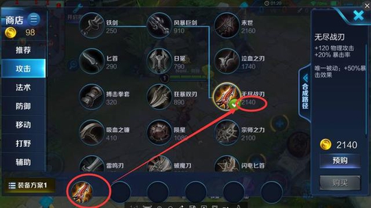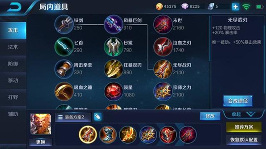 在出完无尽之后再出鞋子和其它输出装备,自己心里大概估计一下,等到所收割的野怪达到20个左右时就可以直接上手二级打野刀——三级打野刀,这样一来就避免了过早地过升级打野刀,而打野刀被动收益不满,高价出”低属性“装备的尴尬局面。