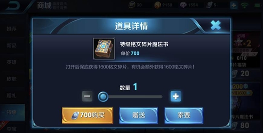 首先是一个特级铭文碎片魔法书,在商城里面有这样的一个东西售卖。然后,这个物品玩家们购买了之后可以直接使用,使用了之后,玩家们可以获得一千六的铭文碎片,也就是说玩家们在购买了这个东西之后,就可以获得一个五级铭文。