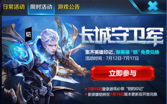 看到这里小伙伴们应该心里有一点想法了,这就跟当初铠预热时活动一样,参与活动,领取徽章,或者完成任务领取徽章,徽章不出意外是可以互相赠送的,并且所有徽章都是一定概率获得,可能孙策徽章在7.14之前是不会出现的,集齐一套徽章后可以免费兑换孙策,但是仅仅只是免费兑换资格,什么时候拿到孙策还是要看天美什么时候让孙策上线正式服,当然,如果到时候有不想做任务的小伙伴也可以准备好自己的13888金币,上线后直接购买即可。