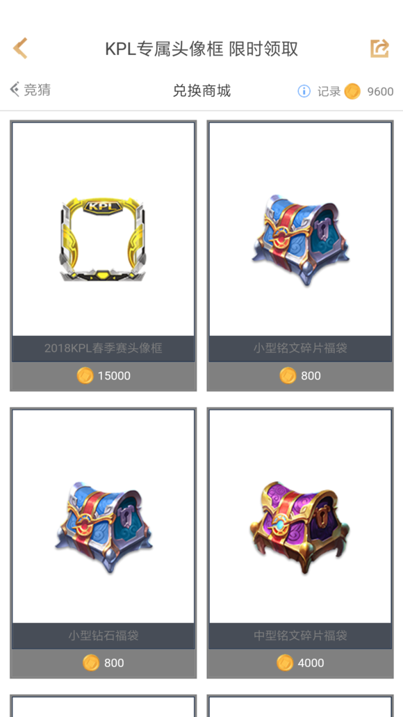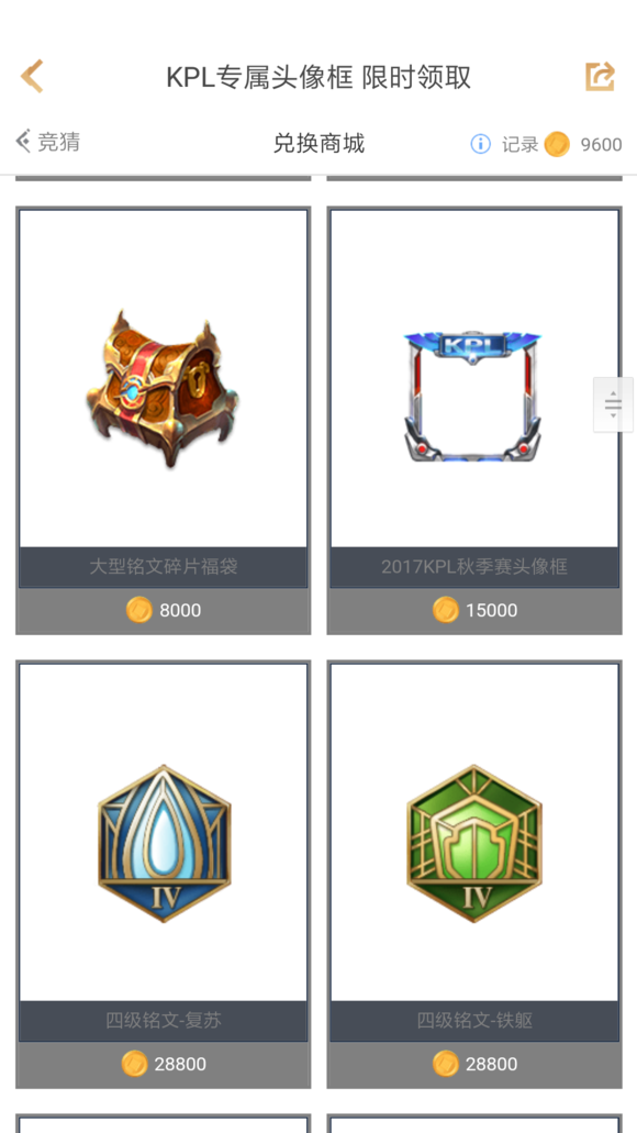 竞猜币相信各位小伙伴在整个春季赛中通过竞猜以及任务也积攒了不少了,小编在这里告诉大家最好尽快去兑换,再过一段时间竞猜币都会清0,等待下一届KPL开赛重新累计,不过现在助手竞猜商城里的实物都被兑换一空,大家可以兑换一下春季赛头像框以及2017秋季赛头像框,这两款头像框都是1.5W竞猜币即可兑换,相信大家手头都应该有足够兑换的头像框。