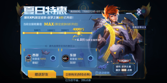 KPL限定皮肤逐梦之光也在今天中午12点开启了售卖,限时售卖至8.12,但是商城页面无法购买,只能从活动页面点进去购买或者赠送,值得一提的是,这款皮肤支持折扣后赠送,也就是532点券,也是十分划算的了,喜欢的小伙伴可以买买买,毕竟早买早享受,并且享折扣,等到时候返场不仅时间周期长,并且还没有任何折扣,了解更多资讯,共享前沿消息,请关注学院主管。