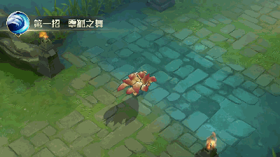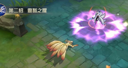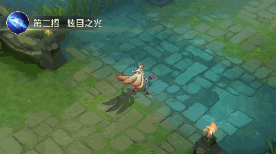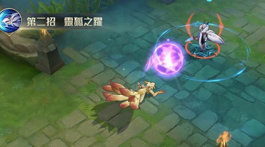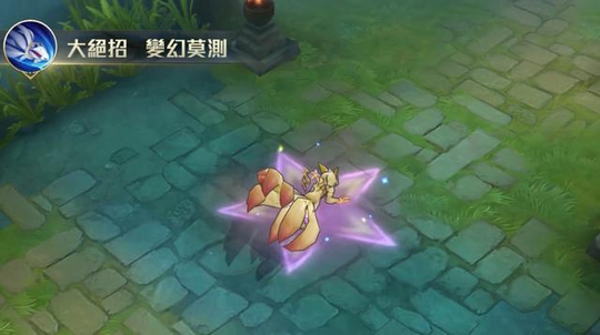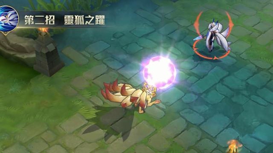 再来看九尾狐的2技能特效。九尾状态下2技能可以朝指定方向跳跃,碰到英雄可以有第二段技能,第二段技能释放如下图演示,这个效果有点想火影忍者鸣人变成九尾后蓄力放大招的感觉。