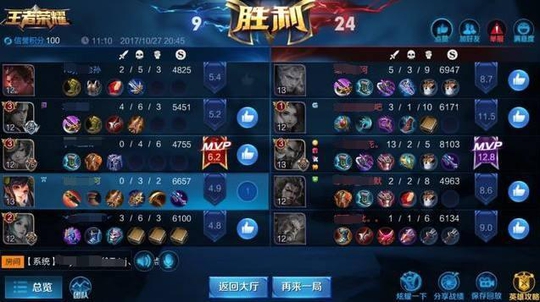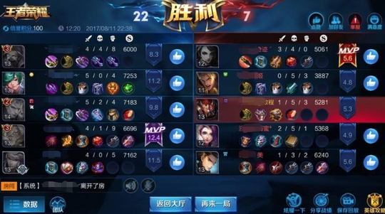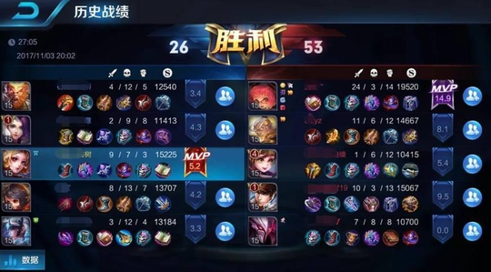 第三名玩家可以说也不错,敌方领先他们17个人头,打了将近30分钟,玩家说:开局是顺风,中路法师开始浪,上单露娜不会玩,直接就崩了,敌方一直压制着打,其实可以说这场对局简直就是幸运局,被对面抓的可以说彻底崩盘了,虽然五个人一直坚持,没选择投降,还是扛不住游戏规则,经济压制实在太厉害,20分钟我方三路高地塔都推掉,好在我们最后守住了谁将,后来在中路开团,被我们抓到一个落单的,给敌方打出了团灭,一波推掉了敌方水晶,赢了对局,感觉算是幸运把,毕竟玩的都不好,都是血泪史!