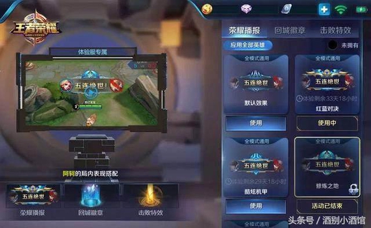 这是非常有趣的个性化定制,你可以对自己喜欢的英雄设定一套非常个性的搭配,拥有不同的回城徽章、击败特效、荣耀播报。这样的个性,对于玩家而言,是非常具有吸引力的。用英雄皮肤不也是为了炫耀吗?不也是为了个性吗?