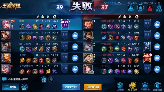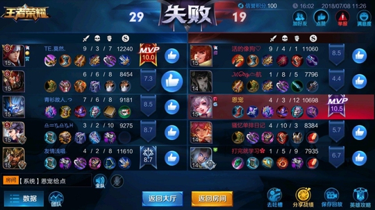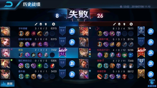 玩家一共玩了10局比赛算下来一共拿了100多个人头,但是没有一局比赛是赢的,比如第一局拿下了12个人头,掌握了整个赛场的节奏,但是没办法,队友不给力特别是猴子和宫本一点用处都没有,直接给对面的刘备打崩了,最主要的是小乔是把武则天打爆的.