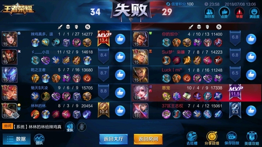 第二局玩家的小乔还是打出很好的成绩,一样把敌方的大乔打爆了,但是也没有用,还是队友不给力,亚索和张飞一点都不给力,惨遭敌方吊打,玩家这时候心情有点不好了,每次自己打得很好,队友都是坑的一逼.