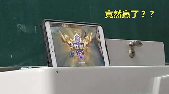可以看到这位学生上课玩游戏被抓,被罚站就算了,游戏还放在讲台,向所有同学展览,而游戏也被迫挂机,估计这个同学现在满脸都是尴尬。