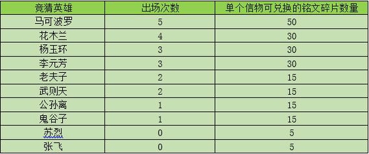 马可波罗出场次数最多,每个信物可兑换50铭文碎片,其次就是花木兰、杨玉环和李元芳了。