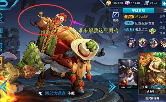 7 牛魔的弱鸡,牛魔身上这只弱鸡好可怜,被牛魔活生生的绑在肩上,看它那可怜的表情快救救它吧。救下之后油炸煎炒都随你。
