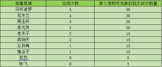 英雄信物在今日更新后开启兑换,时间从7.10更新后到7.16,一共七天时间,活动里表示在KPL春季赛决赛比赛中,英雄上场的场次越多,其信物可以兑换的奖励越好。上场五场及以上可以兑换50铭文碎片,上场3场~4场可以兑换30铭文碎片,上场1场~2场可以兑换15铭文碎片,而压根没有上场的则是只有5铭文碎片了,下面就是春季赛上场英雄次数统计了,大家可以看一下哦。