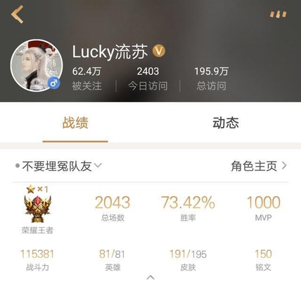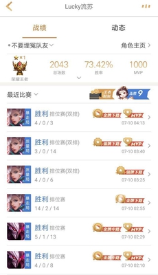 这是流苏的个人游戏账号,2043场游戏对局,MVP次数不多不少,刚好1000场(平均每两场能保证自己拿一次MVP)全英雄(81个),也是刚刚到达王者段位!
