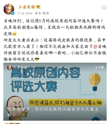 王者荣耀在今年的五月份推出一个高校原创内容评选大赛,也是吸引了很多原创玩家的喜欢,踊跃参与到大赛里面。如今王者荣耀官方也是选出最佳的几个作品,并且成功进入到王者荣耀策划大大的眼中,目前正在制作,不久就会上线了。