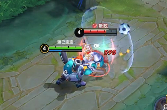 二技能机关魔爪,朝指定方向拍击,眩晕范围内的目标。技能特效在拍击时朝前飞出一个足球,并带有破空的效果。