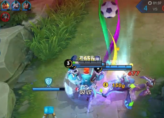刘禅的一技能小霸王护盾,生成一个护盾并提高刘禅移动速度,使下一次普攻击飞敌方。特效在拍击地面时产生一个足球高高弹起,并且还有三色彩带,与蔡文姬的舞动绿茵皮肤二技能特效类似。