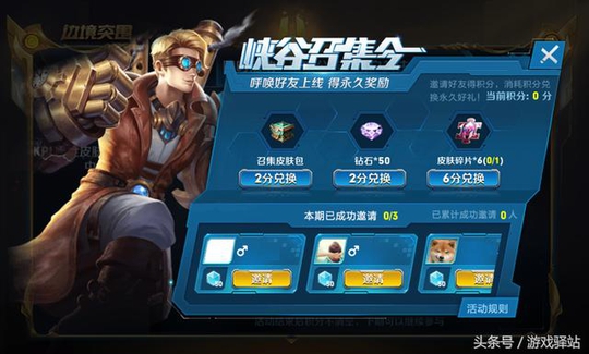 如上图所示,该福利可通过活动面板中的限时活动参与,持续到7月16号结束,玩家只需点击列表中的邀请好友按钮即可,若好友回归登录游戏即可获得一份召集奖励和1积分,攒够一定数量的积分可用来兑换皮肤礼包、6个皮肤碎片和钻石,其中兑换皮肤礼包只需两积分,奖励包含了2个英雄碎片和四款永久皮肤,本期的永久皮肤为夏侯惇战争骑士、墨子金属风暴、虞姬加勒比小姐和达摩大发明家!