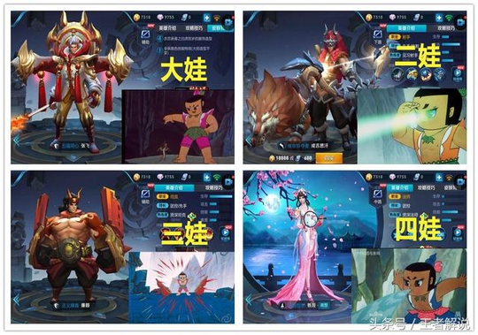 大娃张飞,大娃的技能就是变大,而王者峡谷能变大的就只有张飞了。二娃千里眼,这个就非成吉思汗莫属了。成吉思汗的一技能可以看穿整个峡谷呢。三娃刀枪不入,这样一个完美的坦克除了廉颇的霸体还能是谁?四娃水娃,要说王者峡谷最会玩水的,那应该就是甄姬了吧。