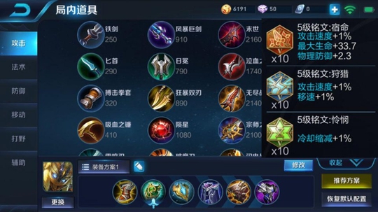 作为一个辅助,出门肯定是要先买学识宝石,因为当第一波兵线出来的时候,你的经济就是全场最低,并且还没有地方发育!而之后就可以立马补上疾步之靴,记得一定要买这个,其他的鞋子都没有它好,剩下的装备基本都是防御装了,只有在团战中生存的更久,才能发挥出更大的作用!而铭文方面则推荐宿命+狩猎+怜悯!