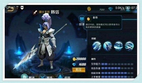 下面是以前的韩信,头发是紫色的,亮点是韩信在以前只需要金币就可以买到,但是需要28888金币才行,钻石要1688可以买了,现在的韩信需要钻石夺宝才可以到手,大部分玩家都是一万左右的钻石玩家才能抽到,目前韩信在体验服已经从水晶商店下架,不知道以后会以什么方式获得。