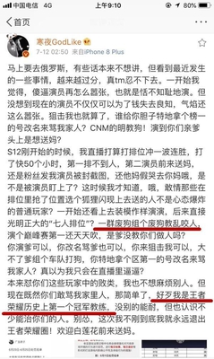 而在今天,寒夜发微博公然怒怼明教,又将矛盾提升了一个层面,一起来看一下吧。寒夜称本来想忍下去的,但是演员越来越猖狂了,甚至连自己的家人都被骂了,这就不行了。寒夜说S12刚开始时候,本来打算冲一波连胜。但要么排不到人,要么就是遇到明教演员,在游戏中公然演戏。现在,明教竟然拿个区第一的大号,公然骂自己的家人,就是一群废狗组成的废狗教在乱咬人。寒夜最后警告明教,好歹自己是KPL的第一个冠军教练,所以认识不少可以惩治你们的人,这次不刚到底自己就会永远退出《王者荣耀》这个圈子。