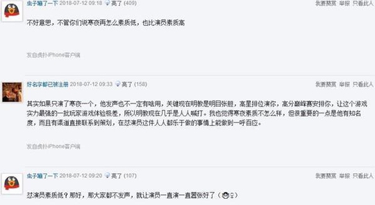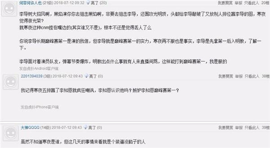 但这次也有站队明教的网友,来看看他们怎么说的吧。某位网友表示,黑焰演你所以你应该去狙黑焰,为什么要公然狙击李导呢?而且李导就是拥有巅峰赛第一的实力,寒夜再不服也是事实,而且李导是先拿第一才加入明教的。也有网友表示,虽然不知道寒夜是谁,但从这几天的事情来看就是个没脑子的人。而且其中一位网友说,寒夜五排赢了李知恩后,就对其疯狂嘲讽,是在嫉妒李知恩巅峰赛第一吗?