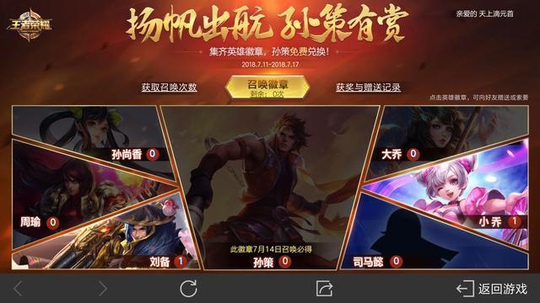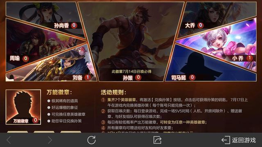 其中孙策的徽章在7.14必出的如果错过那就只能看看有没有机会拿到万能的徽章,得到的话就可以用万能徽章兑换了。
