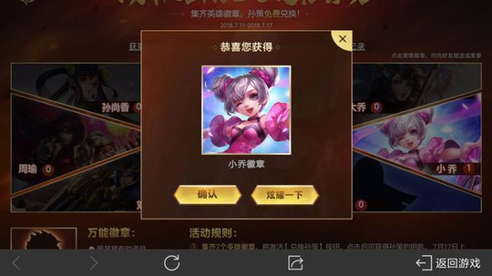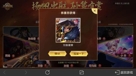 今天玩几局就获得了2个徽章,一个小乔和一个刘备所以说要集齐7个徽章很容易的。
