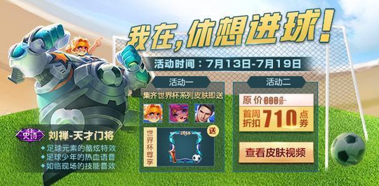 刘禅新皮肤天才门将首周折扣710点券,将在7月13日凌晨0点上架,也就是今晚12点之后。其次还推出了2018世界杯限定头像框一个,如果同时拥有三款世界杯系列皮肤,即可在活动面板上免费领取。