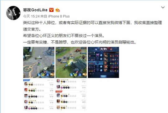 寒夜是谁?王者荣耀KPL史上第一个冠军教练,在圈子里面的人脉多了去了,天美官方都不知道认识多少人,普通网友如果收集到了演员的证据,还可以直接给寒夜反馈,他会直接整理提交,不放过任何一名演员!