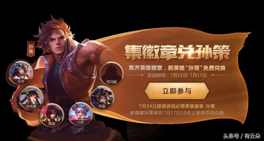 目前集徽章免费兑换新英雄孙策活动正在开展中,不知道你有没有集齐呢?更多资讯,请关注有云朵!