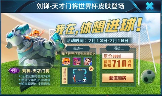 活动内容:刘禅世界杯皮肤——天才门将首周8折优惠上线!集满三款世界杯主题皮肤,还可以获得2018世界杯纪念头像框!