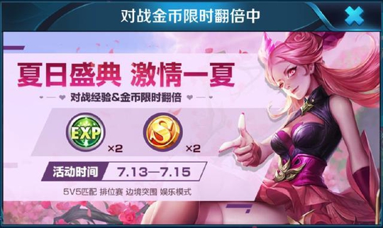 活动内容:召唤师在活动期间,参与排位、边境突围、娱乐模式、5V5匹配均可以在对局结束后,获得双倍的经验与金币!使用双倍加成的道具最高可以获得4倍收益哦!