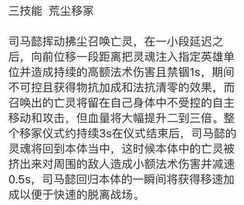 三技能:荒尘移冢,这个名字听起来很霸气了,可以召唤亡灵,用亡灵攻击造成紧固,提升自身血量,技能释放结束后可提升司马懿的移速效果,感觉很强。